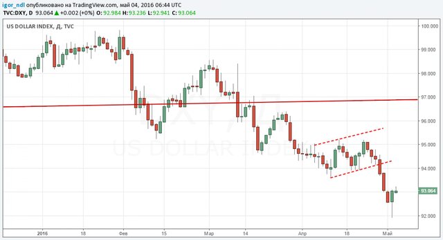 На прошлой неделе индекс доллара к корзине шести основных валют довольно активно снижался. С технической точки зрения произошел выход из формации, и падение ускорилось, однако этот сценарий уже полностью отыгран, так что сейчас прогнозировать достаточно трудно.