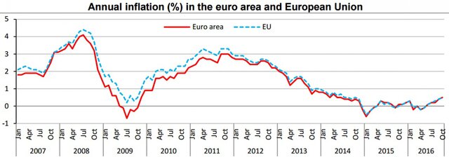 Инфляция в еврозоне в октябре ускорилась с 0,4% в сентябре и стала максимальной с июня 2014 г. Показатель совпал с предварительными оценками и прогнозами аналитиков.