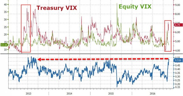 Теперь сравним индексы волатильности VIX для рынка акций и рынка облигаций. Эти индикаторы указывают на степень напряженности на рынке, проще говоря, на степень уровня риска. Так вот, на рынке трежерис уровень риска находится на максимумах за последние 9 месяцев, а вот по акциям, наоборот, на минимуме за последние 2 месяца. В итоге относительный риск находится на максимуме с августа 2013 г.