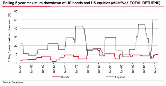 На самом деле, здесь нет ничего удивительного. Это текущая ситуация скорее противоречит привычному пониманию рынка. Дело в том, что за последние 75 лет максимальная просадка по рынку облигаций не превышала 20%, и то только в крайне редких случаях, а вот для рынка акций это вполне себе нормальное явление.