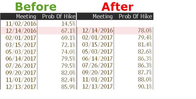 "Комитет считает, что условия для повышения ставки федерального финансирования продолжали укрепляться, однако принял решение дождаться дальнейших доказательств прогресса по достижению своих целевых показателей".Этого было достаточно, чтобы вероятность повышения ставки в декабре взлетела с 68% до почти 80%.
