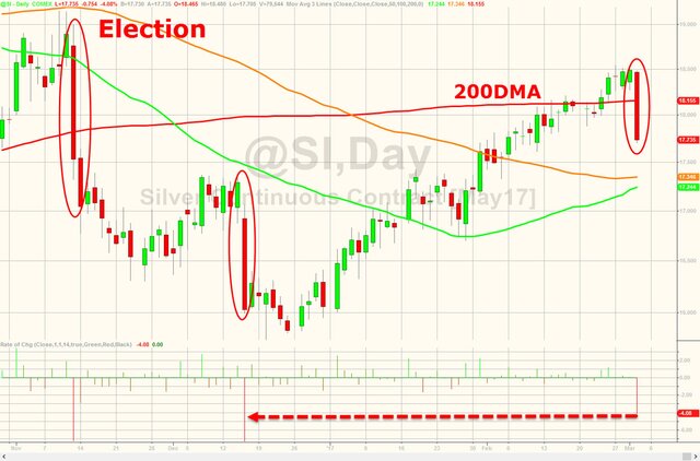 Ну а накануне вообще на рынке происходили любопытные события. После закрытия европейских площадок мощнейшие продажи наблюдались в другом драгоценном металле - серебре. Кто-то в одночасье влил в рынок 23 тыс. контрактов. В результате цены на серебро продемонстрировали сильнейшее падение с момента декабрьского повышения ставок со стороны ФРС.