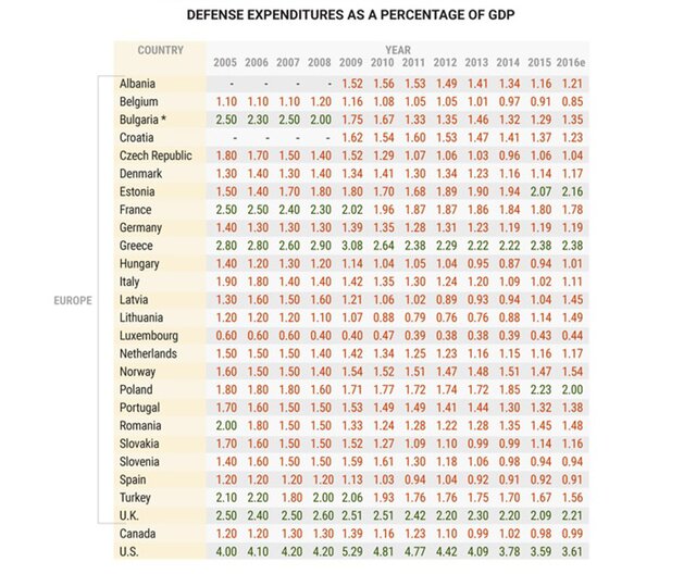 В 2006 г. страны НАТО договорились на саммите в Риге, что расходы на оборону у всех стран-членов НАТО должны составить 2% от ВВП. В этом году шесть стран подошли к этой отметке: Болгария, Франция, Греция, Турция, Великобритания и США. В 2016 г. только пять стран: Эстония, Греция, Польша, Великобритания и США.