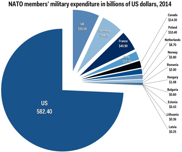 Расходы членов НАТО на оборону никогда не будут равны. Например, Хорватия никогда не потратит на оборону тот же объем средств, что и США. Как видно из приведенного графика, ВВП США составляет около 50% от общего объема ВВП стран НАТО и население достигает 32% от общей численности населения участников Альянса, и, тем не менее, расходы США на оборону составляют 72% от общих расходов всех стран НАТО.Есть только одна страна, которая вкладывает пропорциональную долю в расходах на оборону, основываясь на своей доле ВВП и численности населения: Соединенное Королевство. Вклад США гораздо больше, чем Королевства.