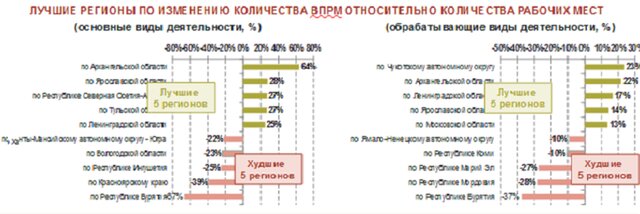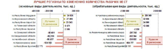 В результате расчетов по своей методологии, "Столыпинский клуб" выделяет лучшие и худшие регионы России по изменению числа рабочих мест.