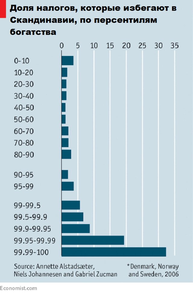 Их исследование сделало два важных вывода. Во-первых, уклонение от налогов чрезвычайно сконцентрировано. Среднее скандинавское домохозяйство недоплатило примерно 3% налогов в 2006 г.; самая богатая часть населения (1% домохозяйств), с чистыми активами как минимум $2 млн, заплатили государству меньше на 10%. При этом, по-настоящему сверхбогатые ведут себя кардинально иначе. Топ 0,01% домохозяйств, с чистыми активами свыше $40 млн, недоплачивают налоговикам аж 30%.
