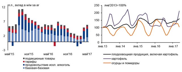 Основной причиной отклонения стала динамика цен на плодоовощную продукцию: рост цен на нее ускорился с ∎3,1% г/г в апреле до 2,0% г/г в мае, что обусловлено нетипично холодной погодой в апреле-мае и соответственно задержкой в поступлении раннего урожая.