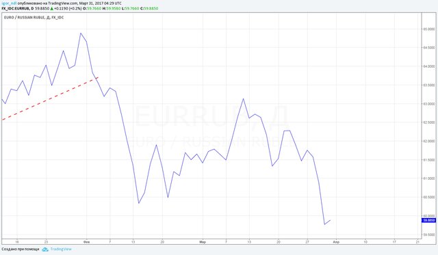 "Собственно говоря, почему так уверенно ведут себя западные фонды, да и наши спекулянты? Потому что ЦБ обозначил свою позицию: он считает, что у него умеренно жесткая политика, которая поддерживает экономический рост, который, по оценкам ЦБ, будет до 1,5%, правда он был даже повыше - прогноз. Мне кажется, это большая иллюзия, поскольку мы уже увидели в феврале мощный спад в промышленности. А то ускорение, которое было в конце прошлого года, оно было вызвано сбалансированной политикой, потому что нефть была $57-58, а курс рубля 61 и нефть в рублях стоила 3300-3400 руб.".ЦБ не решится на интервенции