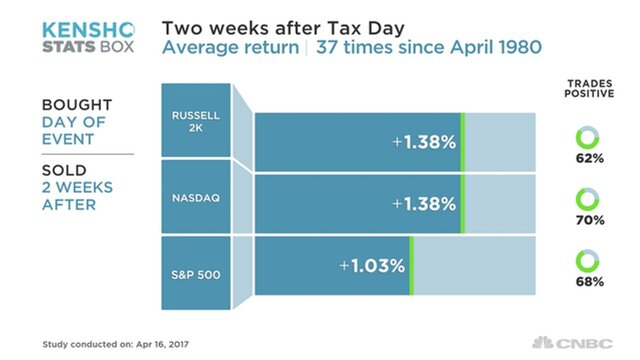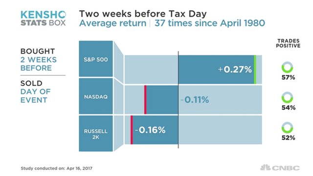 Аналитическая программа Kensho, которую используют хедж-фонды, показывают динамику некоторых основных фондовых индексов за две недели до последнего дня подачи налоговых деклараций в США. В этом году День налогов (Tax Day) приходится на 18 апреля.