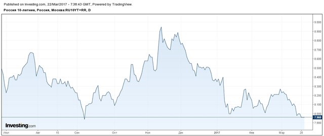 Несмотря на внешние факторы, доходности российских облигаций на вторичном рынке снизились и по десятилетним бондам находятся на уровне ниже 8%.