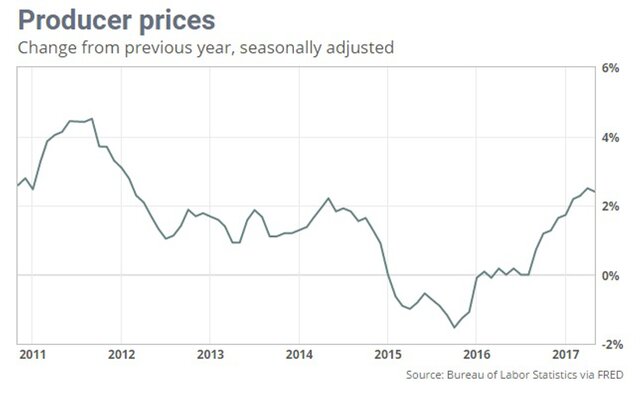 Тем не менее, инфляция более широко распространена после того, как она была в основном невидимой в 2016 году. 12-месячный темп оптовой инфляции в мае составил 2,4%, что было выше нуля годом ранее и всего на отметке ниже пятилетнего максимума.
