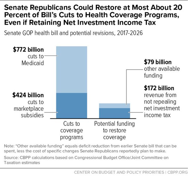 Вывод заключается в том, что структура законопроекта - прекращение грандиозного федерального финансирования для расширения Medicaid в Obamacare, ограничение расходов на Medicaid и сокращение финансовой помощи для частного покрытия - может не стать спасением, даже если власти США продолжать брать налоги с богатых слоев населения.