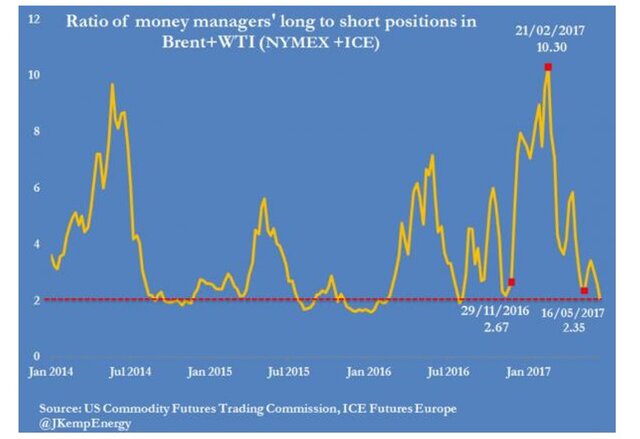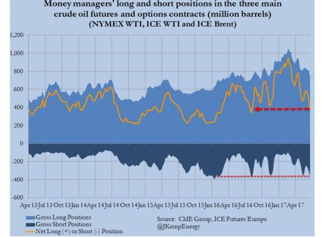 Эксперты предлагают обратить внимание на позиционирование. В конце прошлого года управляющие хедж-фондами так поверили в способность стран ОПЕК и других независимых производителей добиться ребалансироваки рынка, что накопили рекордную чистую длинную позицию в нефтяных фьючерсах. В середине февраля она достигла почти $1 млрд контрактов, однако уже в середине следующего месяца цены пошли вниз.