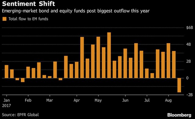 По данным EPFR Global, за неделю, завершившуюся 16 августа, инвесторы вывели $1,7 млрд из фондов акций и облигаций развивающихся стран. Это максимальный недельный отток средств в текущем году.