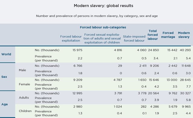 По данным исследования по "взрослому" рабскому труду, по состоянию на конец 2016 г. к этой категории относились более 40,3 млн человек. Из них, по оценкам экспертов, 16 млн были задействованы в принудительной работе в частном секторе; 15,4 млн стали жертвами насильственных браков; 4,8 млн человек находились в сексуальном рабстве; более 4 млн человек принуждаются к труду государственными структурами.REPORT: New data shows 40 million in modern slavery and 152 million in child labour around the world. https://t.co/Zi6vG5QwHR pic.twitter.com/USWKf6oZ9s