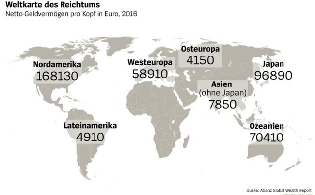 Объем денежного имущества за вычетом всех налогов и сборов также вырос на рекордную величину - 128,5 млрд евро. И хотя благосостояние населения азиатских стран заметно улучшилось, все равно нельзя до сих пор сказать, что богатства распределены в мире равномерно. Если на каждого жителя Северной Америки приходится в среднем 168 130 евро, то жителю Восточной Европы остается всего лишь сумма в 4150 евро. Специалисты Allianz не учли в своем исследовании данные о благосостоянии жителей Африки, самого бедного континента на планете.