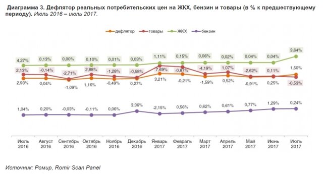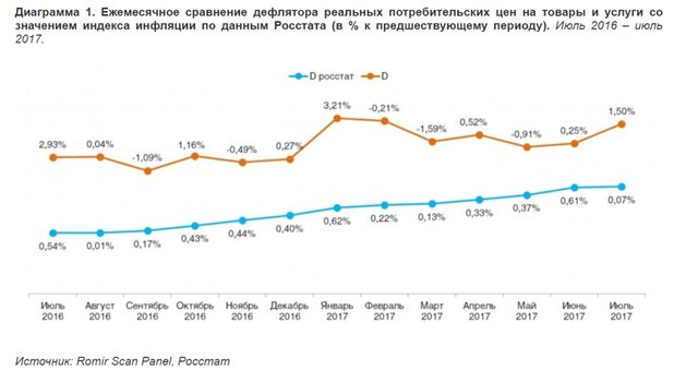 Исследовательский холдинг Ромир разработал методику расчета специального статистического индекса – дефлятора, отражающего реальные изменения общего уровня цен на товары и услуги за определенный период.