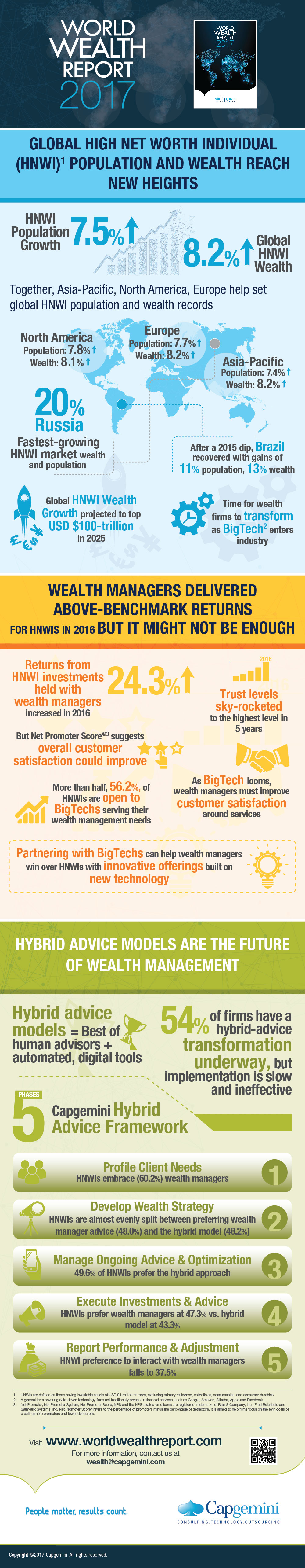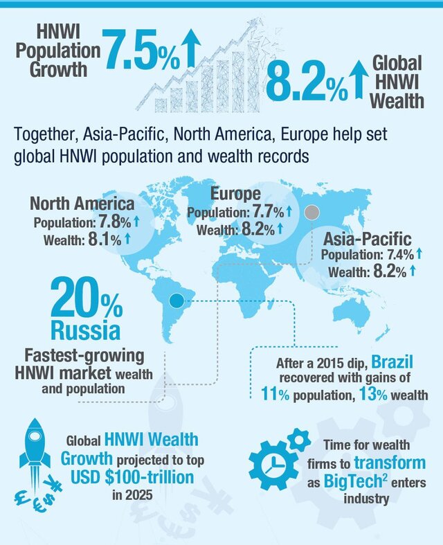 По оценкам консалтинговой компании Capgemini, за 2016 г. количество частных лиц, владеющих крупными состояниями (high net worth individuals, HNWI) увеличилось на на 1,15 млн (+7,5%). Общий объем активов, которыми они владеют вырос на 8,2%, достигнув рекордных $63,5 трлн.