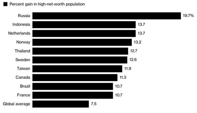 В частности, по данным доклада Capgemini, Россия заняла первое место по росту числа миллионеров – за прошлый год их число в стране увеличилось на 30 тыс. (+19,7%), достигнув 182 тыс. человек. Также заметно выросло число обеспеченных людей в Индонезии (+13,7%), Нидерландах (+13,7%), Норвегии (+13,2%), Таиланде (+12,7%), Швеции (+12,6%), и ряде других стран.