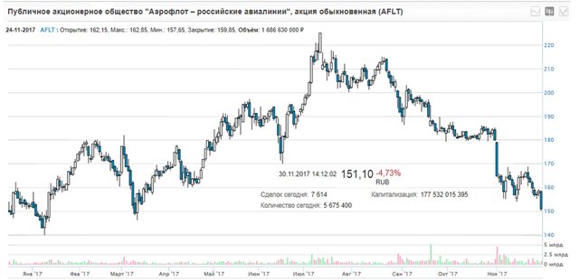 Москва, 30 ноября - "Вести.Экономика". Акции "Аэрофлота" в четверг в ходе торгов рухнули после публикации отчетности компании и оказались в лидерах снижения на Мосбирже.