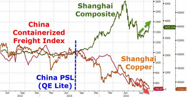 Из приведенного ниже графика видно, что стоимость меди и стоимость фрахта снижаются практически синхронно, а вот фондовые активы чувствуют себя заметно лучше, но о том, что акции уже давно не отражают состояние экономики говорить лишний раз даже не стоит.