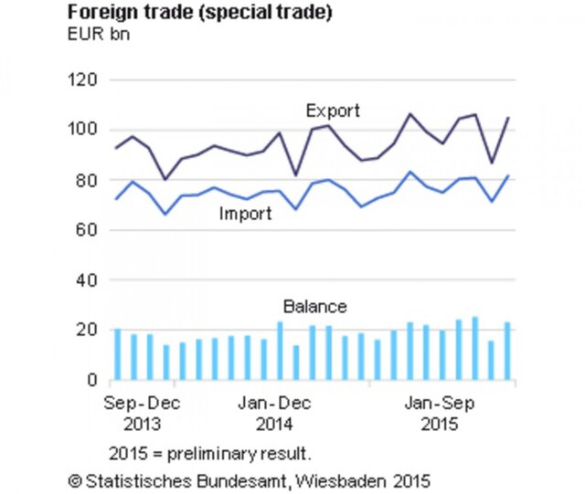 Положительное сальдо внешнеторгового баланса Германии в сентябре 2015 г. составило 22,9 млрд евро по сравнению с 21,6 млрд евро годом ранее, свидетельствуют данные Национального бюро статистики. Опрошенные Bloomberg аналитики прогнозировали профицит в размере 20 млрд евро. С учетом сезонных и календарных факторов профицит торгового баланса в сентябре сократился до 19,4 млрд евро ($20,9 млрд). Пересмотренный показатель за август составил 19,7 млрд евро.