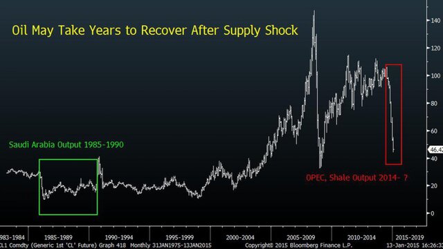 Bloomberg. Динамика цены нефти за последние 30 лет.