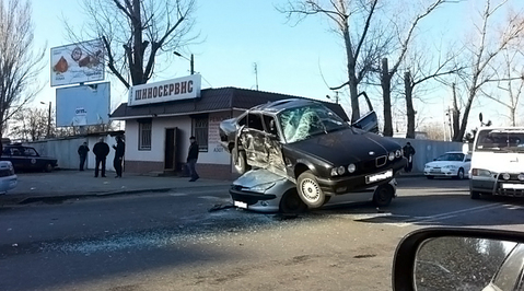 В Одессе утром 10 марта произошло удивительное ДТП: автомобиль BMW буквально "запрыгнул" на крышу автомобиля Peugeot.