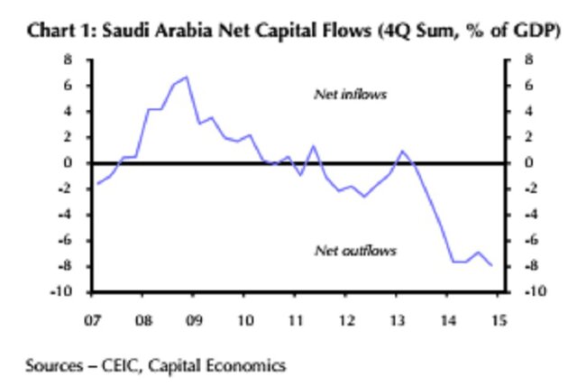 После арабской весны Саудовская Аравия столкнулась с оттоком капитала в размере 8% ВВП ежегодно. Резервы упали с $737 млрд до $672, то есть они сокращаются примерно на $12 млрд в месяц.