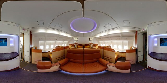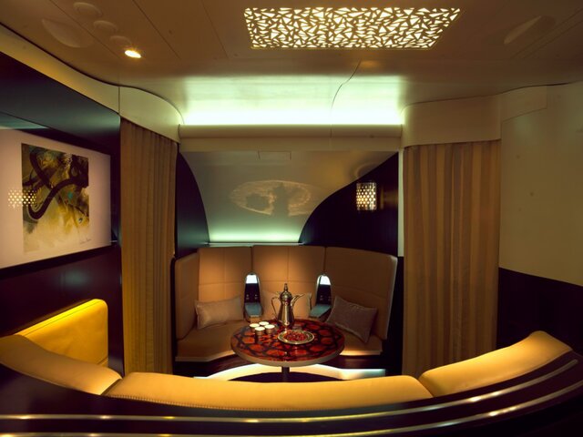 Зона первого класса включая элегантные зоны отдыха и всего 6 мест, что дает пассажирам максимальный уровень приватности и ощущение эксклюзивного частного самолета.