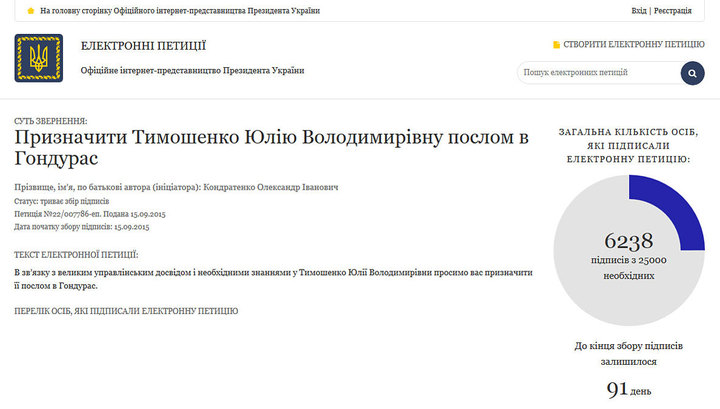 Украинцы собирают подписи под требованием отправить Юлию Тимошенко куда подальше. На официальном сайте президента Украины интернет-пользователи разместили петицию, в которой просят Петра Порошенко назначить экс-премьера страны послом в Гондурасе.