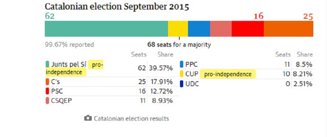 Вместе с 10 местами в парламенте, которые получила еще одна партия, выступающая за независимость - CUP, лагерь сторонников независимости получает абсолютное большинство в региональном парламенте, состоящем из 135 мест.
