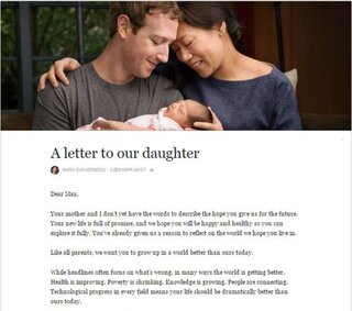 В своем письме, которое Цукерберг адресовал дочери, он также пожелал ей вырасти в мире, который будет лучше нынешнего: "Это мир, где наше поколение сможет продвигать человеческий потенциал и поощрять равенство — излечивая болезни, индивидуализируя обучение, осваивая экологически чистую энергию, соединяя людей, строя сильные сообщества, снижая уровень бедности, обеспечивая равные права и расширяя понимание между странами".