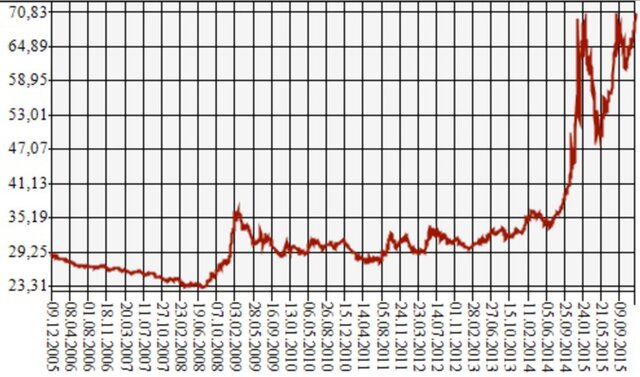 Динамика официального курса пары доллар-рубль (2005–2015)