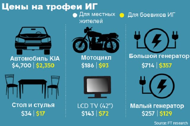 В каждой провинции действует специальный офис, которые подсчитывает долларовое значение захваченного имущества и платит одну пятую часть боевикам, которые участвовали в рейде. Невоенные товары затем продаются на местных рынках, при этом члены ИГ могут купить эти товары за полцены.