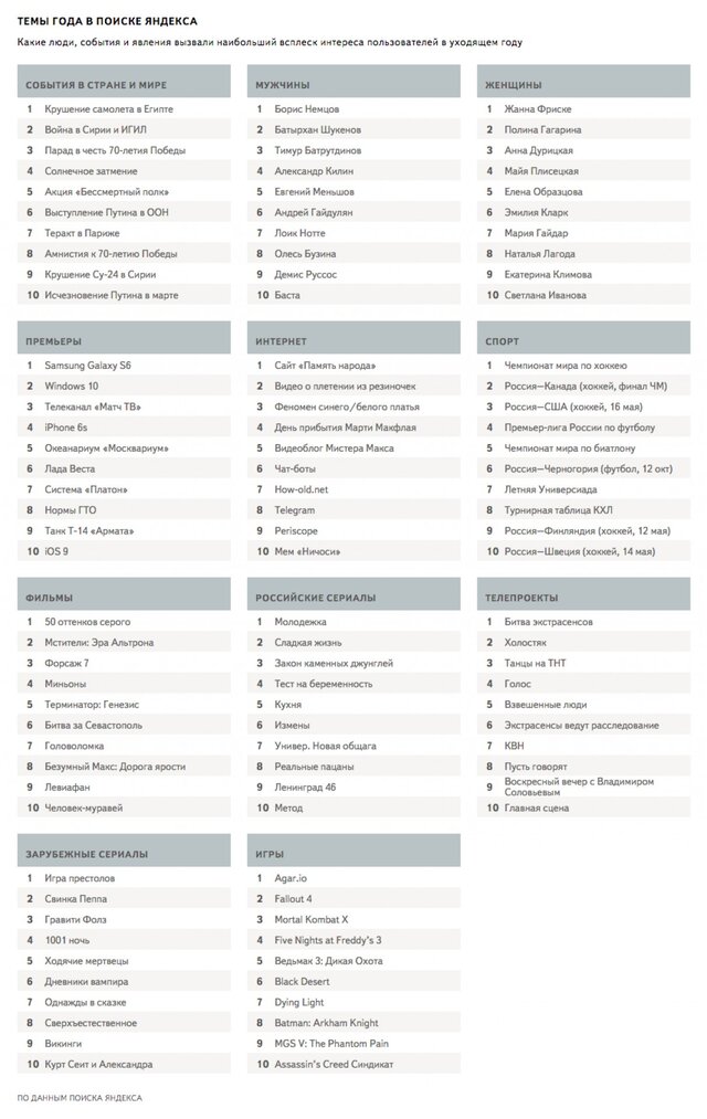 В среде интернета самым популярным стал запрос о сайте "Память народа", запущенном к годовщине победы в Великой Отечественной войне. В сфере игр пользователей более всего интересовала браузерная игра Agar.io, Fallout 4 и Mortal Kombat X.