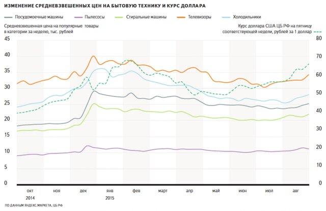 По сравнению с первой неделей июня официальный курс доллара вырос более чем на 20%. За тот же период (с первой недели июня по третью неделю августа) популярные модели холодильников в российских интернет-магазинах подорожали на 7%, цены на стиральные машины увеличились на 9%, на телевизоры — только на 4%.