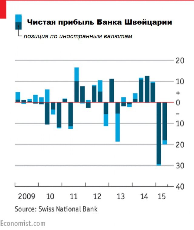 Швейцарский национальный банк (SNB) объявил об убытках в 20 млрд швейцарских франков ($20 млрд) во II квартале, что стало продолжением таких же плохих первых трех месяцев года. В итоге убытки SNB с начала 2015 г. достигли колоссальной цифры - 50,1 млрд франков или эквивалент 7,5% ВВП Швейцарии.