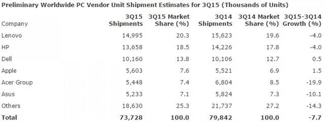 International Data Corporation (IDC) также отмечают снижение отгрузок на 10,8% за период с июля по сентябрь.