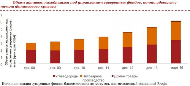Например, общий объем мировых активов, находящихся под управлением суверенных фондов, увеличился с примерно $3 трлн по состоянию на конец 2008 г. до более чем $6 трлн в марте 2015 г.