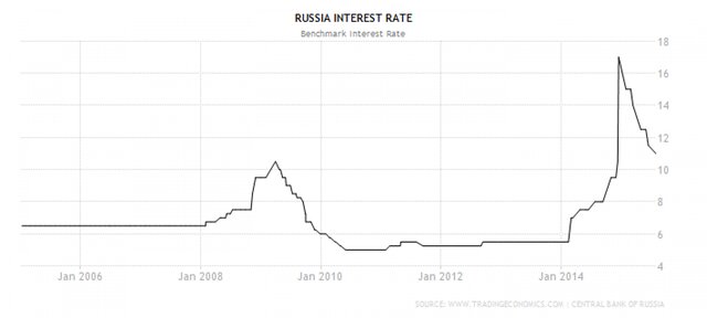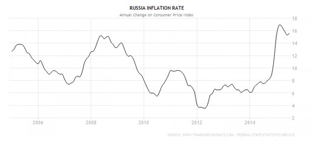 Что касается инфляции, то она в этот раз взлетела заметно выше, чем в 2010 г. И это очень важный момент. При общем падении заработных плат инфляция делает людей беднее, как следствие они сокращают потребление. Динамика розничных продаж говорит сама за себя - падение почти на 10%, при том, что темпы роста этого показателя сокращаются с 2012 г.