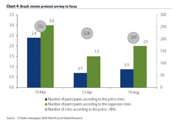 Понятное дело, что люди выходят на улицы, как правило, тогда, когда их терпению приходит конец и появляется какой-то повод. Про терпение говорить не приходится, ведь реальный сектор бразильской экономики находится под очень сильным давленеим, бразильцы пережили во втором квартале сильный рост инфляции при высоких ставках. В стране стагфляция - одна из самых неприятных форм кризиса.