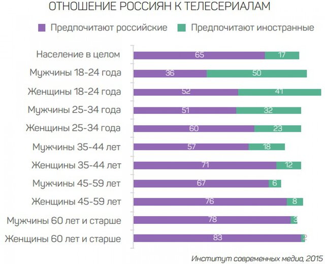 По данным на июль 2015 г., за полгода, предшествующие проведению опроса, зарубежные сериалы посмотрели только 32% россиян. Среди молодежи доля смотревших зарубежные сериалы составила 53%, среди зрителей старше 60 лет – всего 16%.