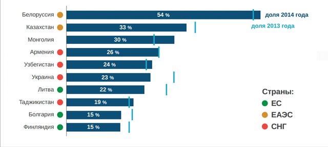 При этом наибольшую долю российского экспорта в своем импорте имеют страны, граничащие с Россией. Значительная доля российских товаров присутствует в импорте стран СНГ, Финляндии, прибалтийских государствах, Монголии.
