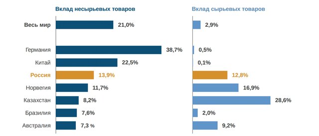 "Анализ показывает: мнение о том, что Россия в основном сырьевая страна – ошибочное. В 2014 году вклад российского экспорта несырьевых товаров в ВВП нашей страны составил 13,9%, а вклад в ВВП экспорта сырьевых товаров – 12,8%.