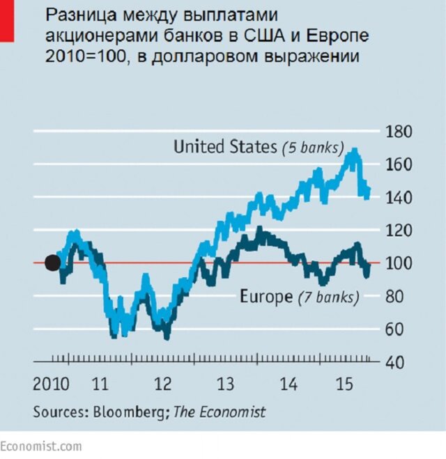 Крупнейшие банки Америки, за исключением Citi, торгуются по более высокой цене к балансовой стоимости активов. Доходы акционеров американских и европейских банков в прошлом были почти на одинаковом уровне; сегодня между ними существует значительный разрыв, отмечает британский журнал The Economist.