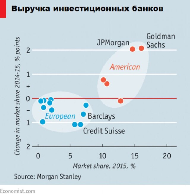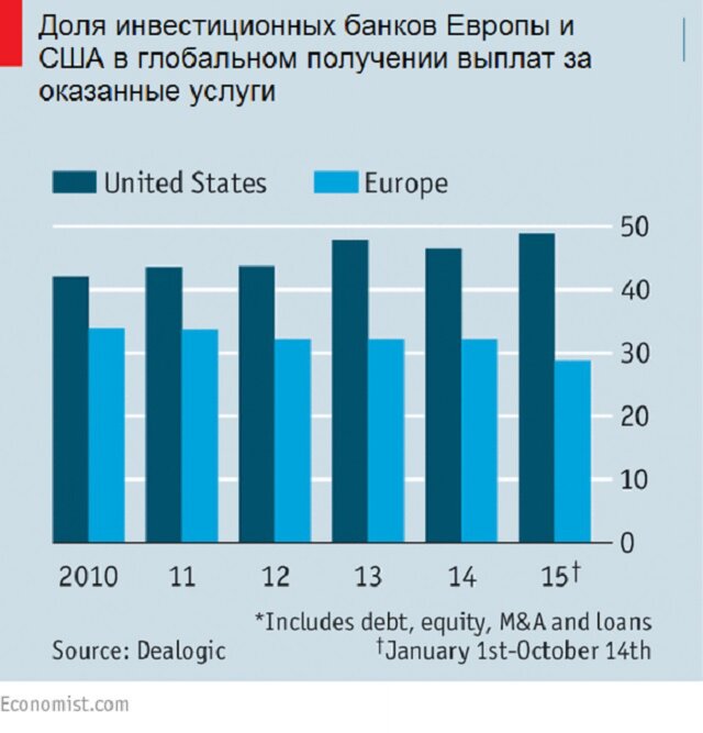 В инвестиционно-банковских услугах Уолл-Стрит неустанно увеличивает долю на рынке за счет европейцев. Европейские банки, разумеется, не очень хотят терять бизнес в таких сегментах как помощь компаниям в привлечении денег на рынке капитала, торговле облигаций и общему движению денег.