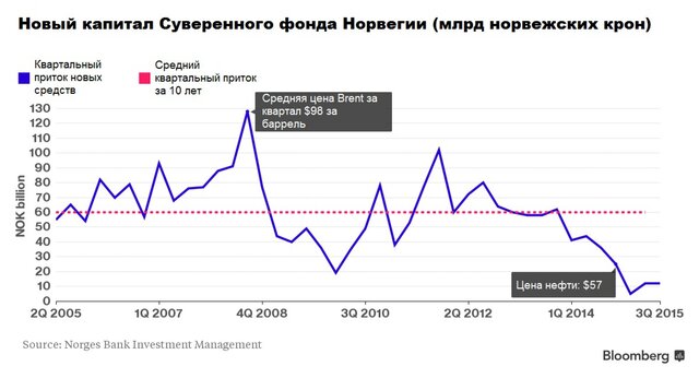 Суверенный фонд Норвегии за последнее десятилетие вырос более чем в шесть раз на фоне бума цен на нефть, но сейчас он столкнулся с новой рыночной действительностью, при которой на рынке могут быть остановлены денежные вливания. Из-за падения цен на сырую нефть на 50% за последнее время, правительство Норвегии планирует изъять из фонда порядка $440 млн для пополнения бюджета.