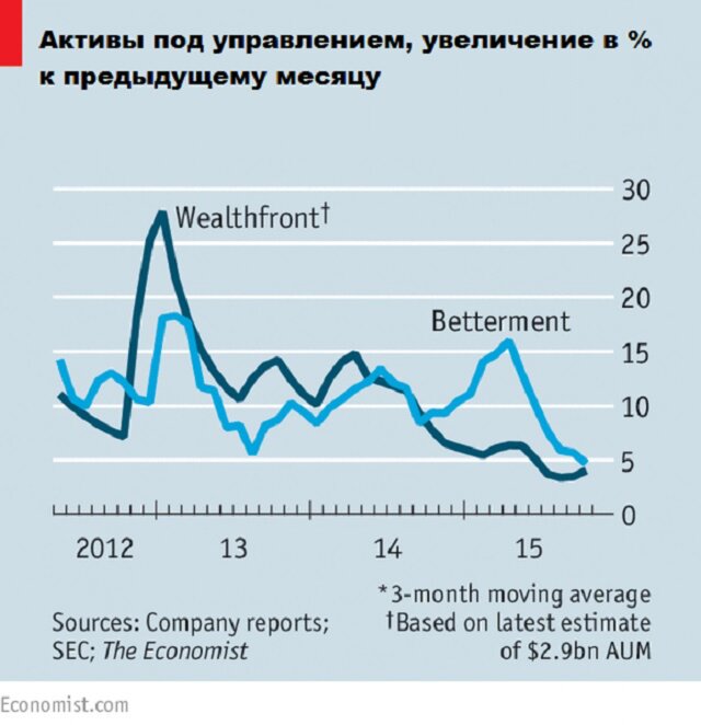Роботы-консультанты, управляемые Wealthfront (штат Калифорния) и Betterment (Нью-Йорк), делают практически тоже самое, но берут за услуги всего 0,25% в год, отмечает британский журнал The Economist.