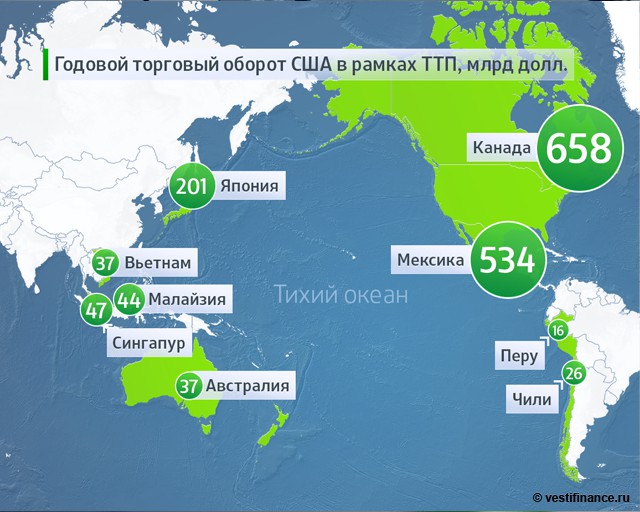 Транстихоокеанское партнерство (ТТП) — планируемая к созданию международная торгово-экономическая организация, целью которой является создание зоны свободной торговли в Азиатско-Тихоокеанском регионе. В настоящий момент условия создания такого партнерства обсуждаются между администрацией Обамы и странами Азиатско-Тихоокеанского региона, однако в их число не входят ни Россия, ни Китай.Аналитики отмечают, что сложившаяся ситуация напоминает ситуацию в XIX веке, когда Британская и Российская империи боролись за влияние в богатой ресурсами и стратегически важной Центральной Азии.